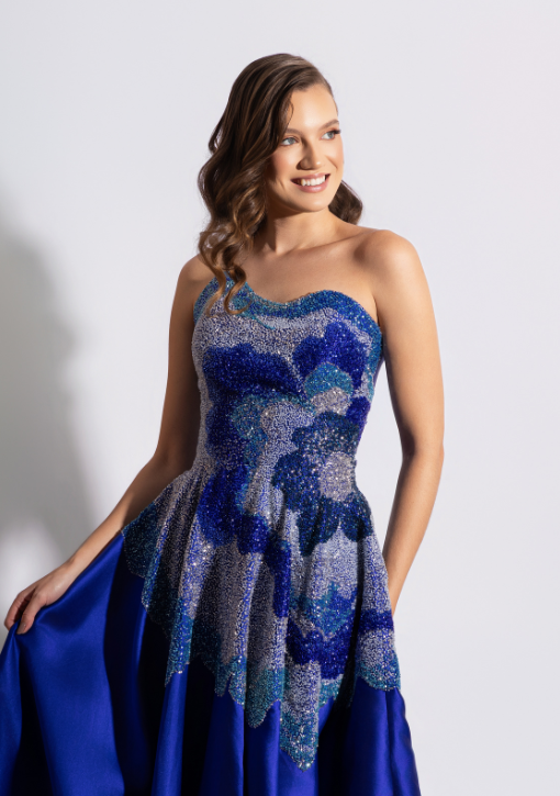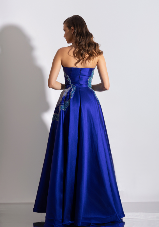 Vestido de festa longo azul royal em zibeline, com modelagem tomara que caia assimétrico que valoriza o colo e traz sofisticação ao visual. O modelo possui saia ampla que garante presença e elegância ao caminhar.