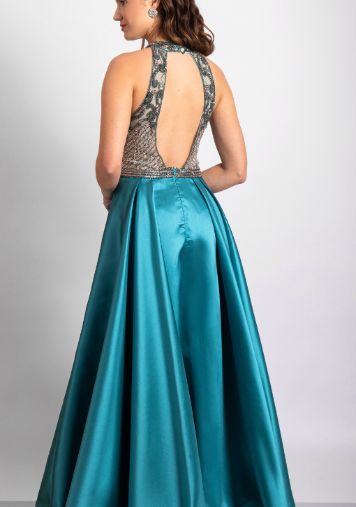 Vestido longo azul turquesa / tiffany em zibeline, com caimento estruturado e saia evasê com fenda; corpo bordado em pedrarias prata, decote halter e costas abertas.