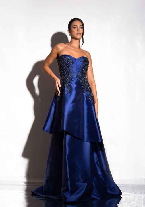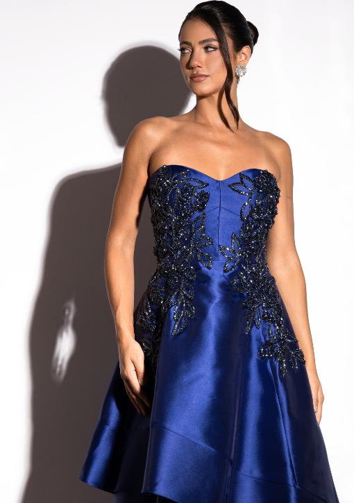 Vestido de festa azul marinho em zibeline, caimento estruturado, saia evasê com camada em sobreposição. Tomara que caia com bordado com decote coração e pedraria.