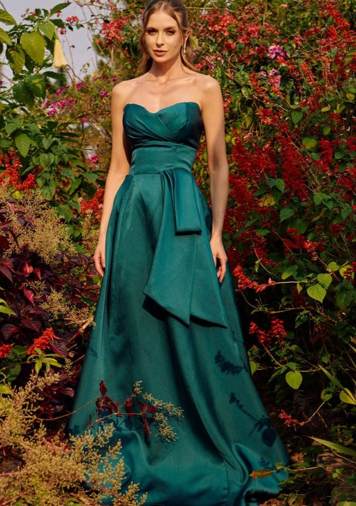 Vestido verde esmeralda, com decote coração, cintura marcada e detalhe na cintura.