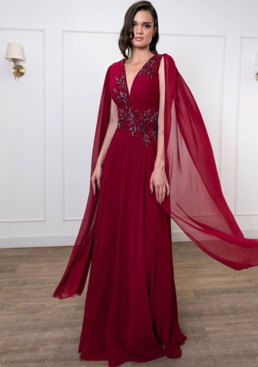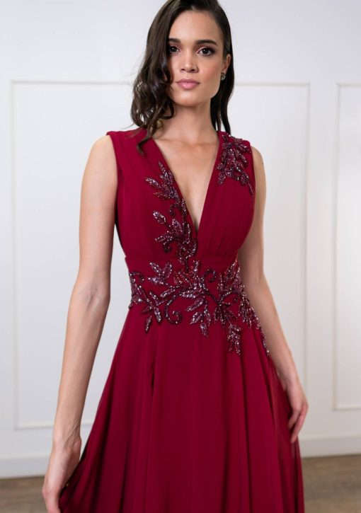 Vestido em crepe marsala, com decote V e bordados em pedraria de mesmo tom na cintura. Com manga capa.
