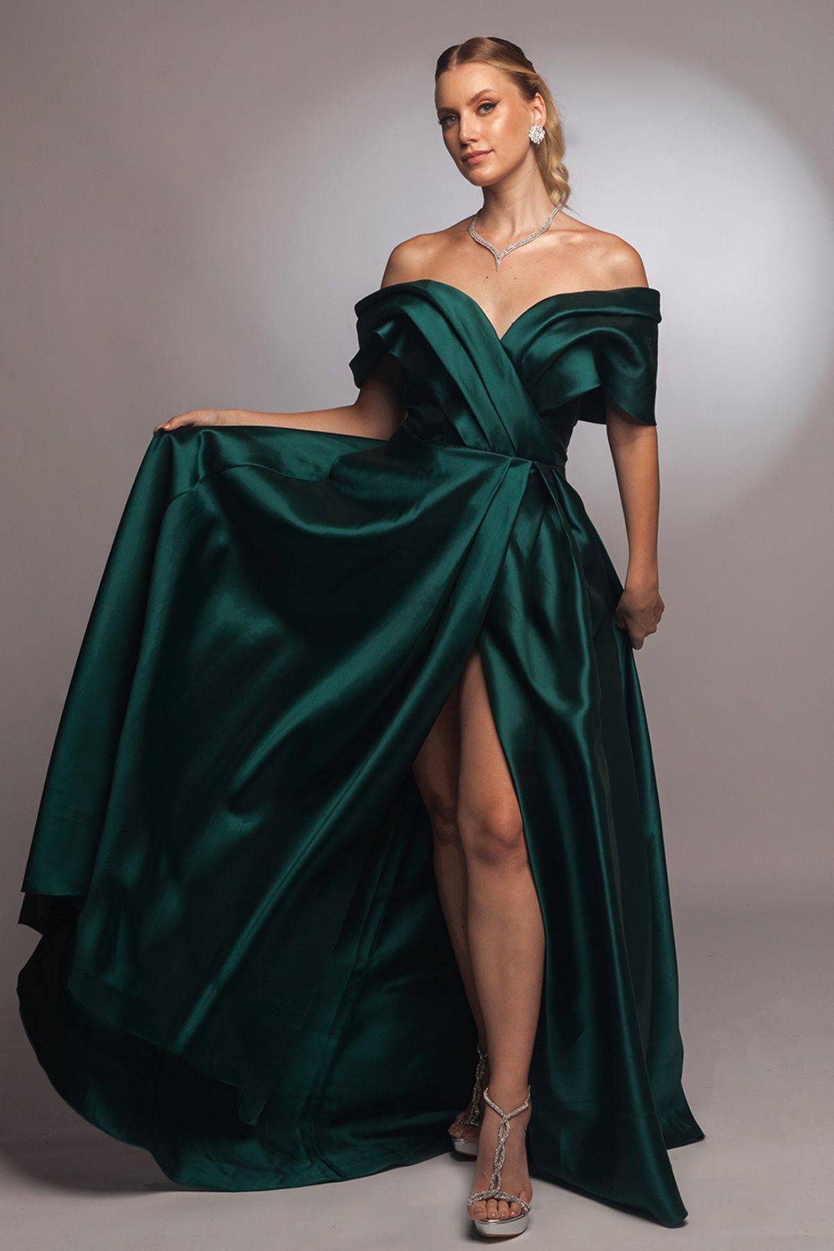 Vestido verde esmeralda/petroleo alfaiataria em cetim duchese, com detalhe ombro a ombro de manga bufante, saia ampla com fenda, decore coração.