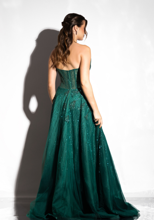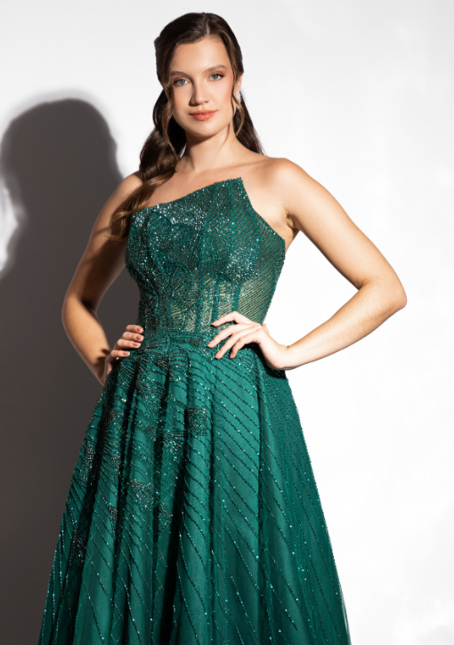 Vestido longo verde esmeralda, confeccionado em tule bordado, que cria um efeito sofisticado e luminoso.