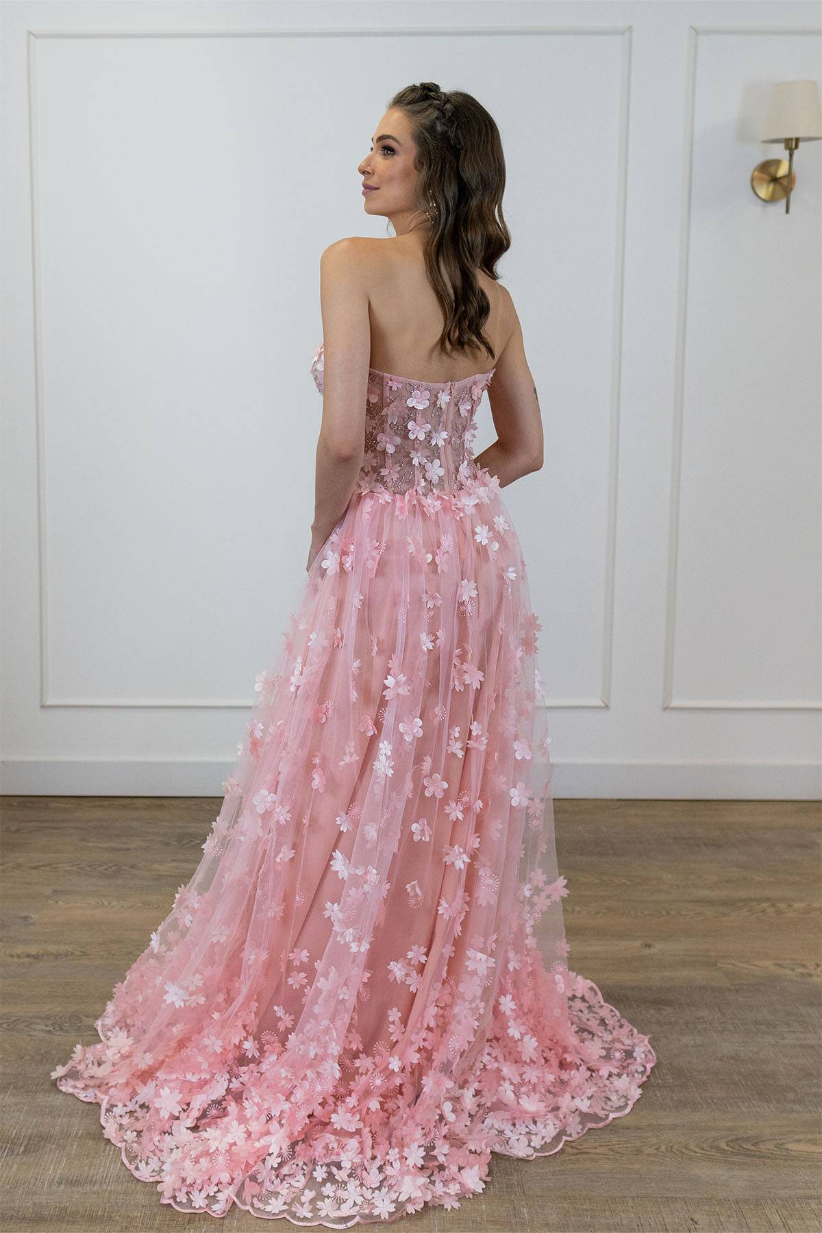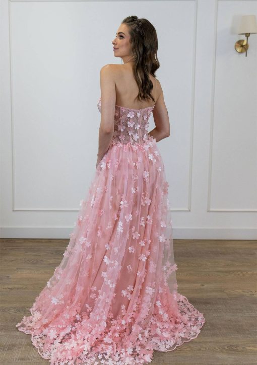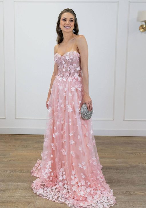 Vestido em tule rose, corpo corpete, com aplicações de flores 3D cortadas a laser em todo o vestido.