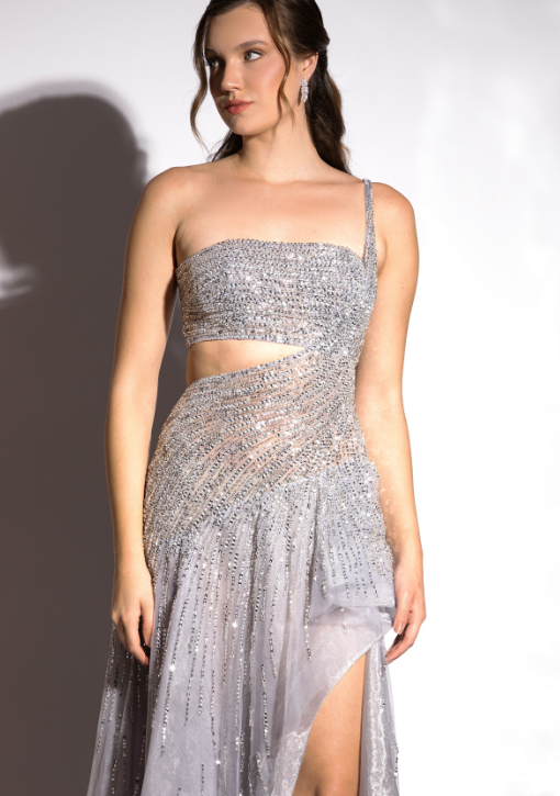 O modelo tem caimento fluido, com modelagem assimétrica e cintura marcada por drapeados estruturados; apresenta decote reto com uma alça única, recorte lateral na cintura, aplicação de pedrarias em desenho radial e fenda alta frontal que valoriza a silhueta. Um vestido impactante e elegante, ideal para quem busca aluguel de vestido de festa longo bordado e sofisticado.