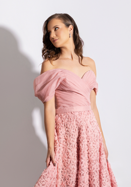 O modelo possui saia rendada texturizada que adiciona delicadeza e movimento, criando um look romântico e elegante.