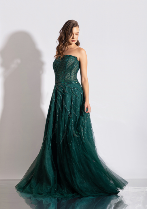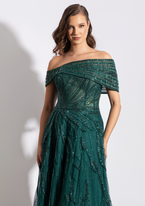 Vestido de festa longo verde em tule glitter com zibeline, inteiramente bordado com pedrarias que trazem brilho e sofisticação ao look.