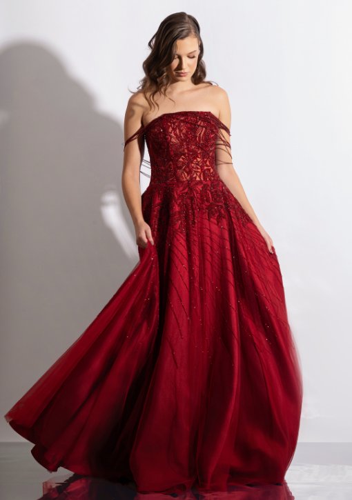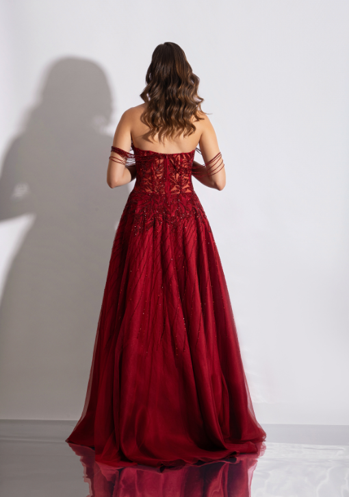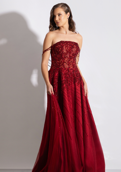 Vestido de festa longo vermelho intenso / marsala em tule bordado, com corpete rico em detalhes que trazem sofisticação e elegância ao visual.