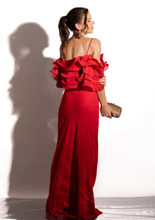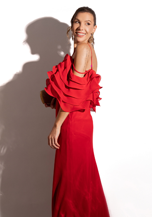 Vestido longo vermelho em musseline, caimento fluido, modelagem reta, alças finas e decote suave, com babados nas mangas e costas abertas — ideal para aluguel de vestido de festa elegante.